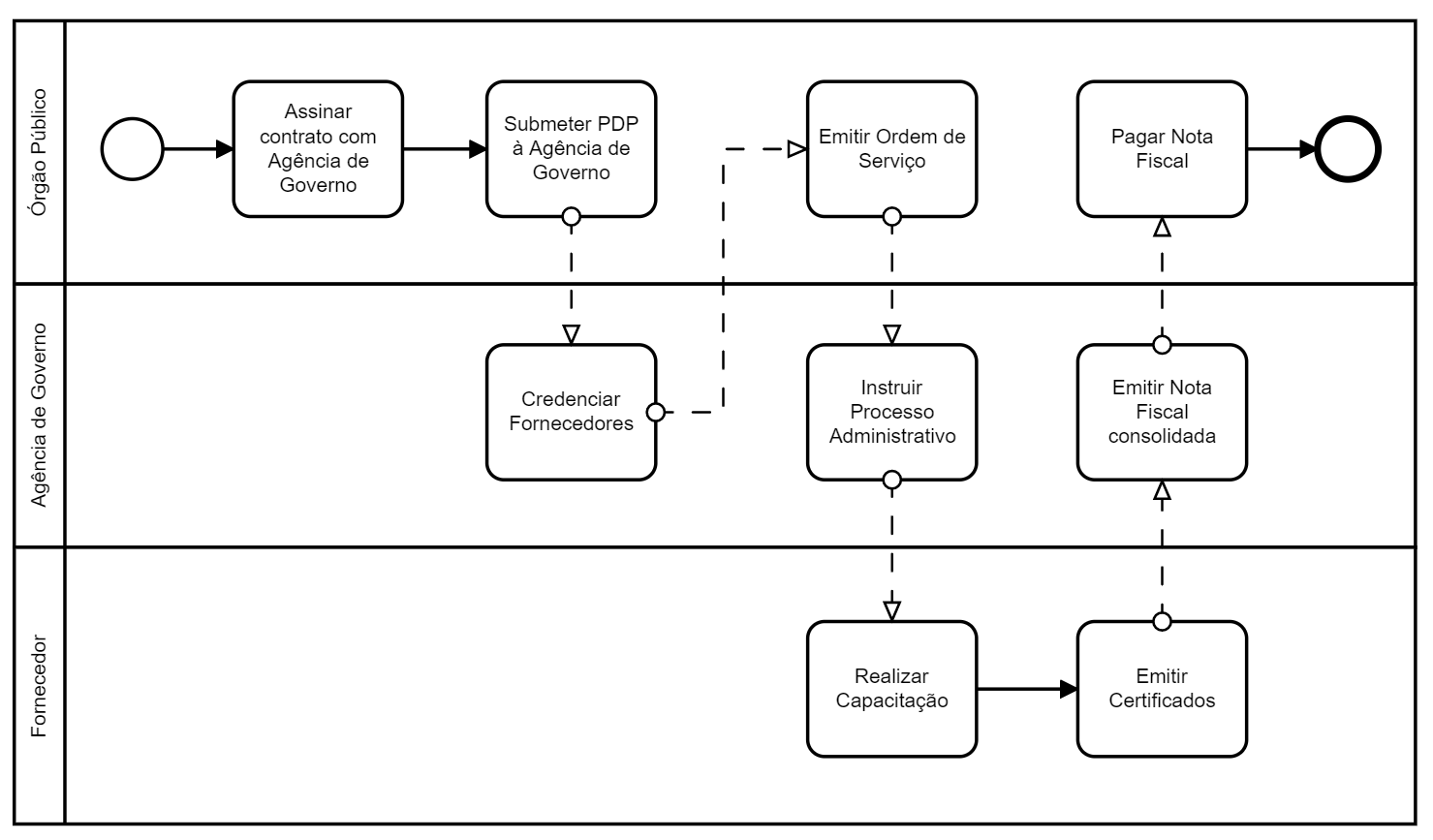 , nós contratamos os treinamentos e os fornecedores indicados em nome dos órgãos públicos, nos encarregando da burocracia. Além disso, disponibilizamos um